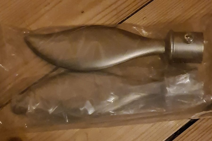 Ett par gardinstångsknoppar i metall i form av löv. Passar till gardinstång som är ca 1,7 cm i diameter.