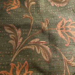 Färgglatt tyg med ett mönster av blommor och fåglar i ränder. Färgerna inkluderar rött, grönt, brunt och vitt.