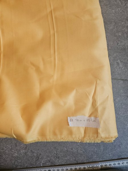 150 cm x1150 cm gult tyg, antagligen i bomull. Lätt satinvävt, för hae trevlig lyster