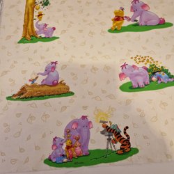 100% bomullstyg med gulligt Nalle Puh motiv på ljusgul botten. Disneytyg. Längd: 4,25 meter. Bredd: 1,46 meter. Vikt: 954 gr. Kommer från djur och rökfritt hem.