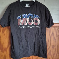 BANDMERCH svart t-shirt, storlek L, t-shirt med rund halsringning och korta ärmar. Udda bandtröja med svart på svart tryck på ryggen. Köpt i Williamsburg innan Reunionspelningen i maj 2018.