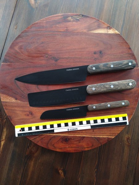 Set med tre Orrefors JERNVERK knivar. En stor kockkniv, en mindre kockkniv och en tandad kniv.