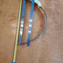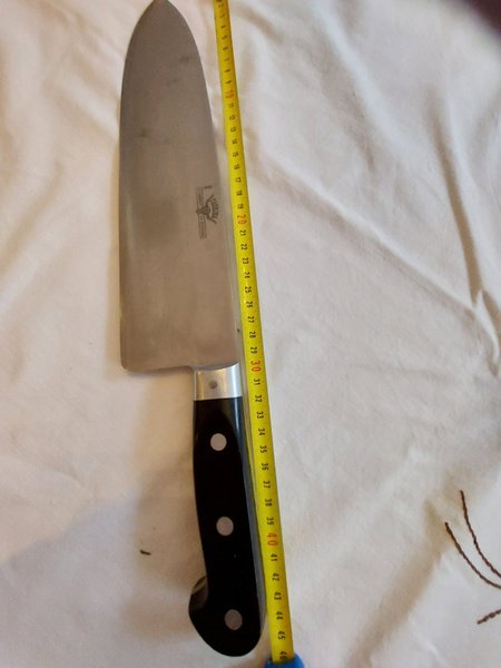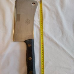 Kockkniv med svart handtag och tre nitar. Kniven har en total längd på 40 cm. Märkt Taurina "Le Diamant du Boucher"