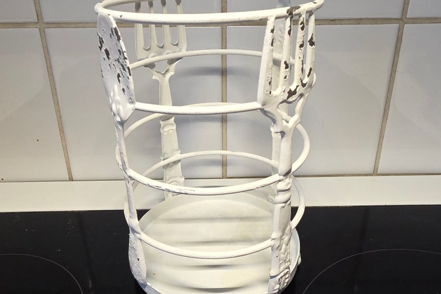 Bestickställ i metall med gaffel och sked som motiv runt om.