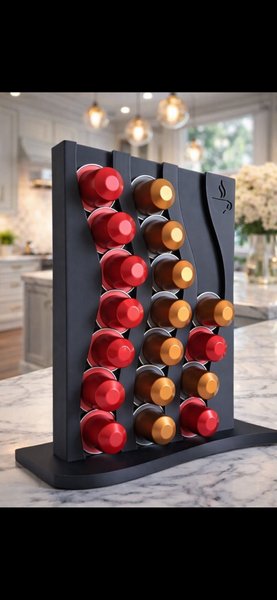 Svart kaffekapselhållare för förvaring av kaffekapslar. Hållaren har plats för flera kapslar och är designad för att stå upprätt på en bänkskiva eller liknande yta.