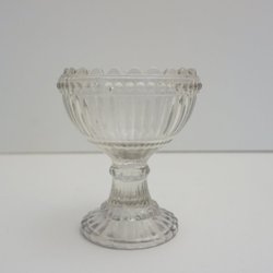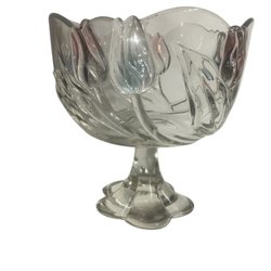 Skål på fot i glas. Blåst ? inget som talar om var och vem tillverkaren sker. Ser ut som den lila skål Simon Gate designade för Orrefors. 21 cm hög, något linande i diameter upptill.