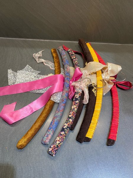 Färgstarka klädhängare med dekorativa detaljer som band och spets.