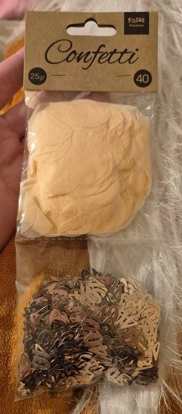 Ett oöppnat set med konfetti för 40år. Två olika i samma paket: rosa prickar och med siffrorna 40.