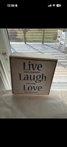 Prydnad i trä med citat, shabby chic. Använd men fint skick. Ska se sliten ut.