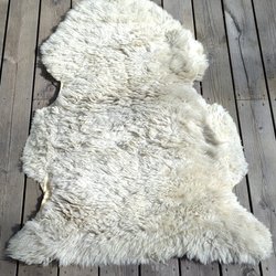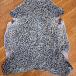 Detta fårskinn kommer från ett gotlandsfår. Lockarna är kortklippta och glänsande. Detta skinn är mer som en matta än som en pläd. Effekten av hur ljuset faller på detta skinnet är unikt.