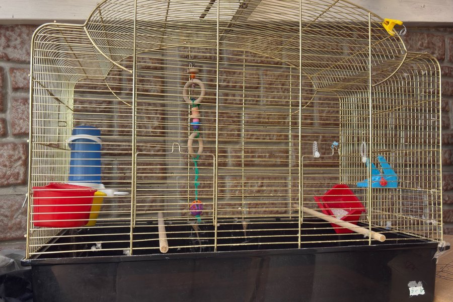 Säljer en stor fågelbo för underlater med kommer tre mat hållare och en vattenflaska åt fåglarna har den stående bara