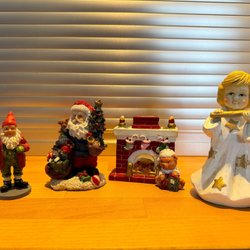 En dekorativ ljusstake i metall med julmotiv. Den har plats för 9 ljus och är formad som en ställning med renar och granar. Ca 45 cm hög och 26 cm i diameter