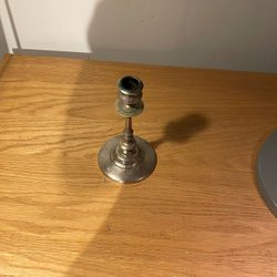 Ljusstake i silverfärg. Inga defekter på utsidan. Dock lite missfärgning på toppen (se bild 2). Överdelen är lös men går att sätta fast med lim.