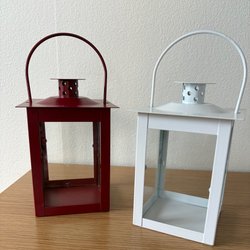 Ett par vita lyktor med handtag. Lyktorna har en bas i metall och en glaskupa. Ljus ingår inte. Höjden är 28 cm och diametern är 12 cm.