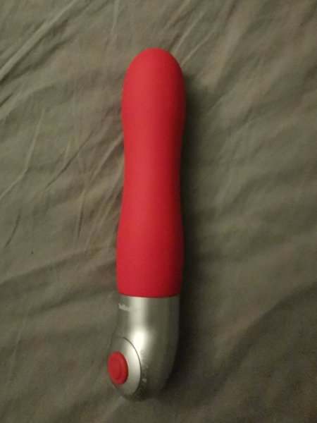 En massageapparat för avslappning och välbefinnande. Den har en röd topp och en silverfärgad bas med en röd knapp.