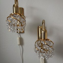 Ett par vägglampor i mässing med detaljerade fästen. Lamporna har lampskärmar och är dekorerade med kristaller. De är försedda med strömbrytare på sladden för enkel användning.