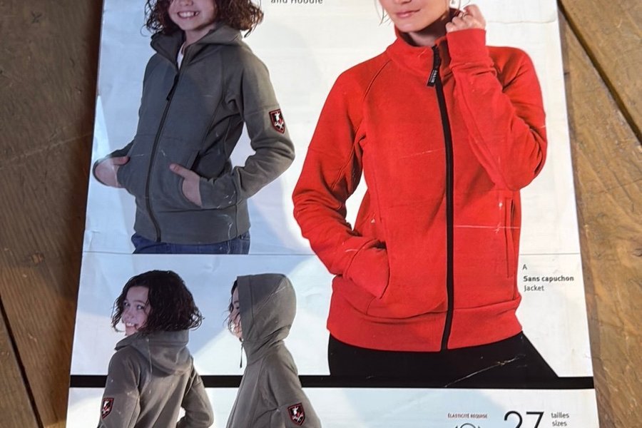 Jalie mönster 2795 för damjacka och hoodie. Mönstret innehåller två varianter: en jacka utan huva och en hoodie med huva. Storlekarna är 27. Saknar plastficka men i övrigt komplett.