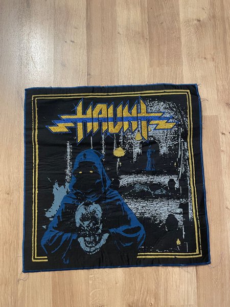 Svart tygmärke med motiv av en figur i en huva som håller i en dödskalle. Märket har en guldfärgad ram och bandnamnet "HAUNT" i guld och blått.