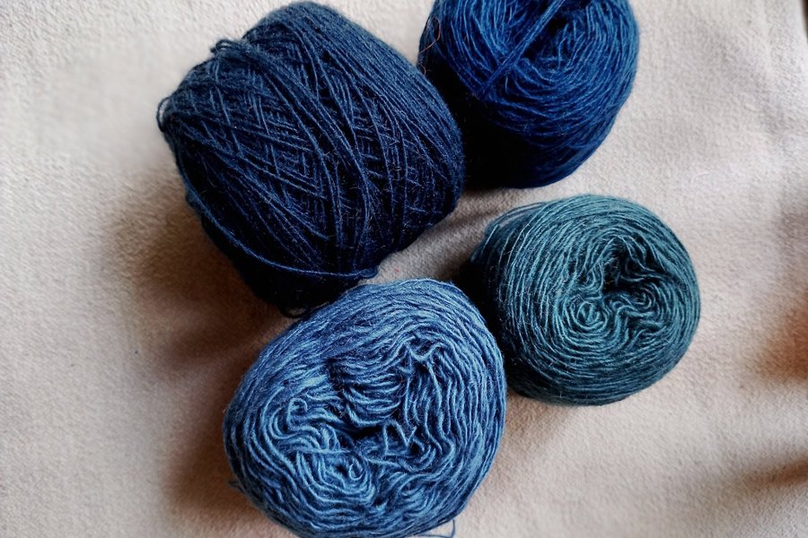 Fyra små nystan med entrådigt ullgarn garn i olika blå färger för vävning eller broderi. De väger sammanlagt 136 gram. ag har fler auktioner på garn och givetvis sampackar jag.
