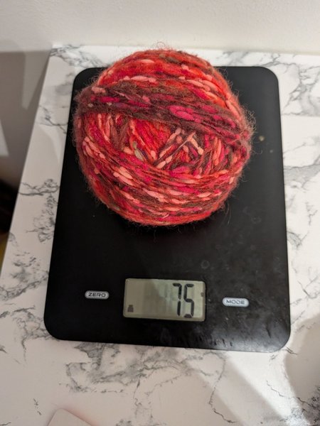 Säljer 75% rött melerat texturerat garn. Osäker på tillverkare och material.