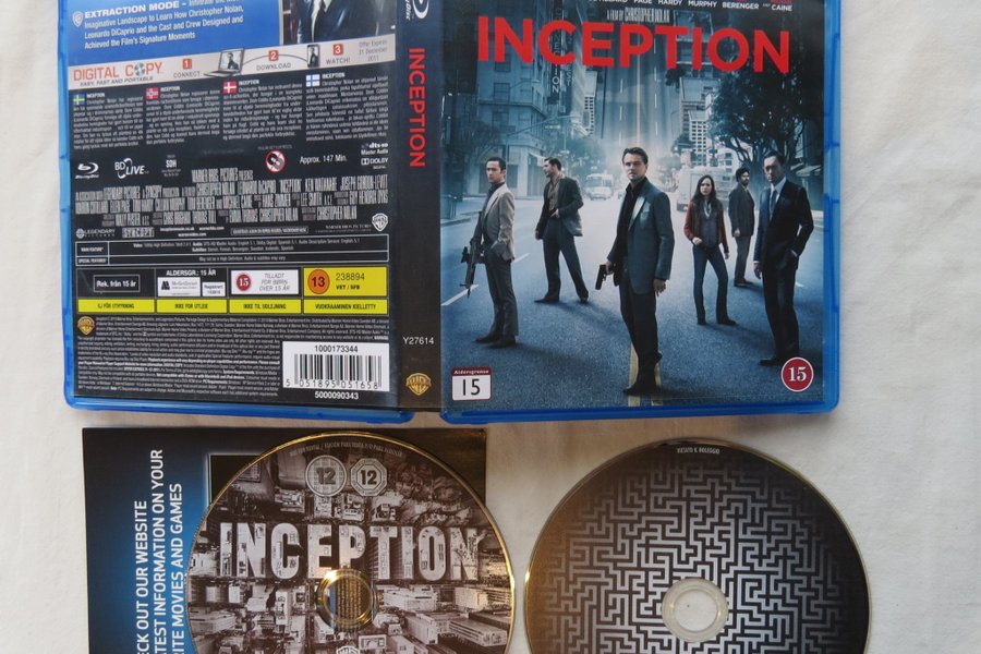 Inception på Blu-ray och DVD. Filmen är regisserad av Christopher Nolan och har Leonardo DiCaprio i huvudrollen. Utgåvan inkluderar en digital kopia. Speltid: cirka 147 minuter. Åldersgräns: 15 år.