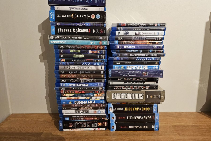 3d och vanliga blu-ray, någon dvd i bra skick. Engelskt tal förutom sons of anarchy serien, den är fransk.