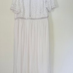 Elegant, ärmlös vit klänning. Klänningen har en v-ringning och ett markerat midjeparti, vilket ger en smickrande silhuett. Den faller mjukt ner till en ankel-lång längd.Dragkedja bak. Aldrig använd endast provad. EU 54 eller motsvarande UK 28.