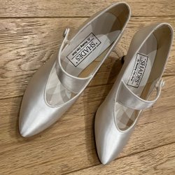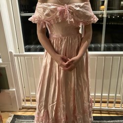 Otroligt Elegant, ärmlös klänning i en ljus nyans. Klänningen har en v-ringning som är dekorerad med pärlor. Den har en figurnära passform upptill och en utsvängd kjol med volanger och halvsläp nedtill. Klänningen stängs med en dragkedja i ryggen. Klänningen är något stor för modellen på bilden. Silke och täckt med spets.