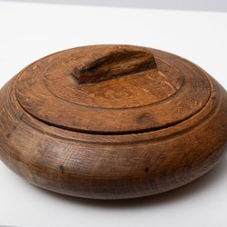 Beskrivning: Ask, svarvat trä. Allmoge, 17/1800-tal. Diameter: 8,5cm. Höjd: 5cm.