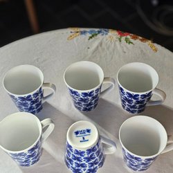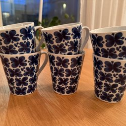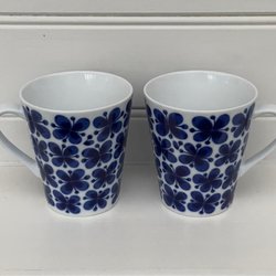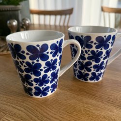 Mugg från Rörstrand i serien Mon Amie, designad av Marianne Westman. Muggen har ett blått blommönster på vit bakgrund.