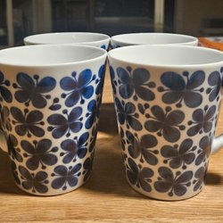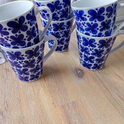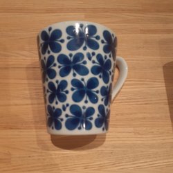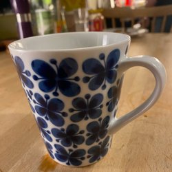 Mugg med ett blått blommönster. Muggen har ett handtag.