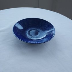 Nio fat från Rörstrand, modell Blå Eld. Faten är i en djupblå färg med ett mönster som liknar flätade korgar. Varje fat har en slät cirkel i mitten.