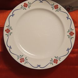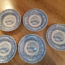 Ett litet nagg på en av tallrikarna, ålderskrackelering förekommer. Mått 24cm i diameter