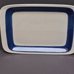 Serveringsfat från Rörstrand, modell Koka. Fatet är vitt med en blå bladmönstrad kant.
