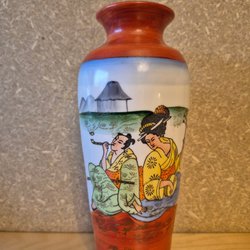 Vas från Upsala Ekeby (UE) Sweden, märkt 4594. Vasen har en brun och orange randig design. Ca 14 cm hög