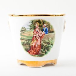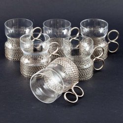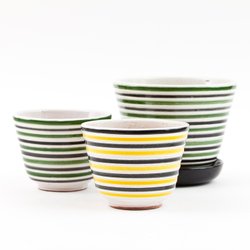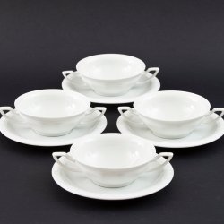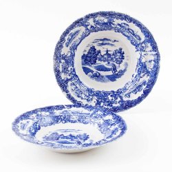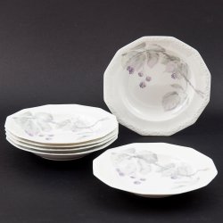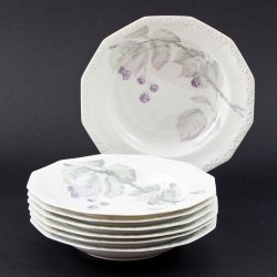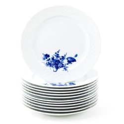 Skick: Mycket fint skick med endast mindre bruksspår. Fin glans i glasyren, aldrig maskindiskade. En tallrik svagt ljusare än övriga (nere t v i bild nr 2), från naturlig variation i tillverkningen.