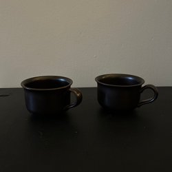 Ett par mörkgröna muggar från Höganäs Keramik. Märkta "Höganäs Keramik STL 008 SWEDEN" undertill.