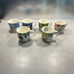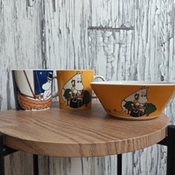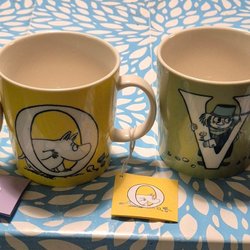 Två Muminmuggar med olika motiv. En röd mugg med Mumin och en grön mugg med Lilla My.