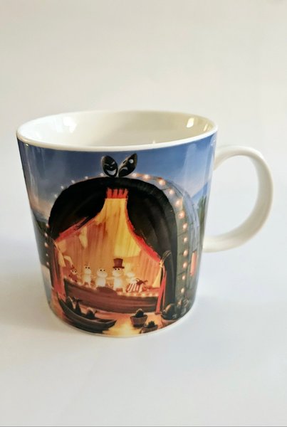 Muminmugg med motiv av Muminfamiljen som uppträder på en teaterscen. Muggen har ett handtag.