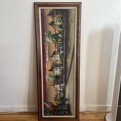 Målad tavla med motiv av en strandkant med vatten, träd och gräs. Tavlan är signerad a: Kenneth Sjöö.