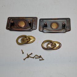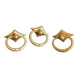 Ett set med möbelbeslag i guldfärgad metall. Inkluderar skruvar för montering. Se bilder för detaljerade mått.