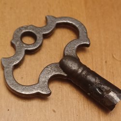 Urnyckel i mässing. Nyckeln har två hål för upphängning och en fyrkantig öppning för uppdragning av urverk.