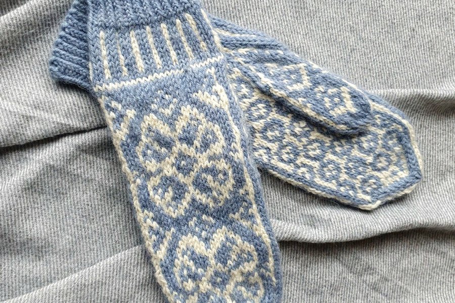 Ett par handstickade vantar i blått och vitt.