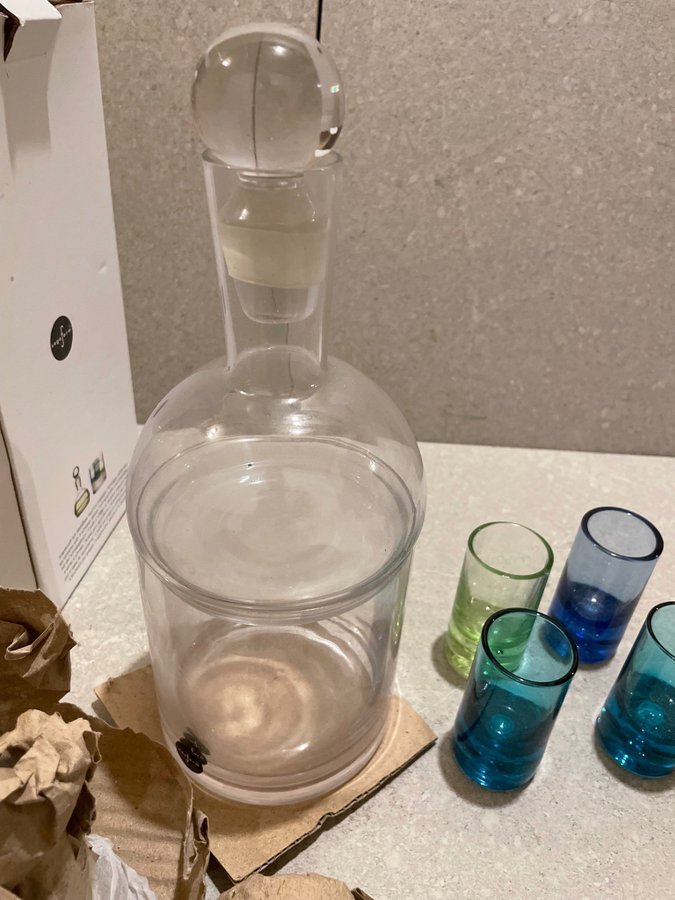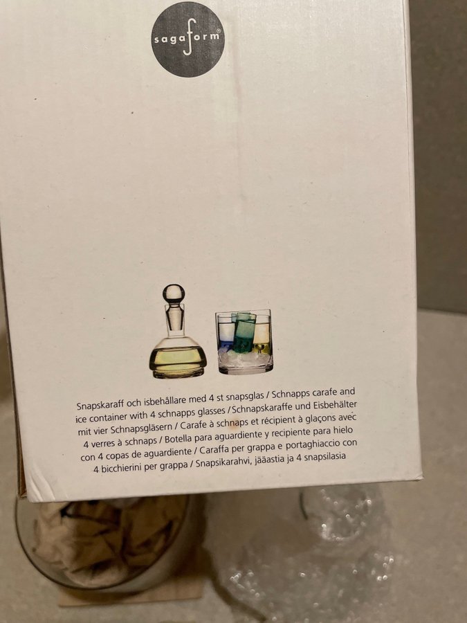 Snapskaraff och isbehållare med 4 st snapsglas från Sagaform. Otroligt stilren inredningsdetalj och praktisk på samma gång! Perfekt att ta fram när man har främmande och vill bjuda på något härligt kallt i glaset. Whiskey, rom eller annat. Snygga och lekfulla färger på snapsglasen.