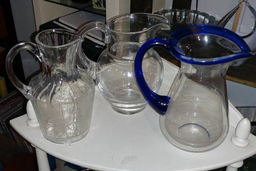 Tre glaskannor säljes. En kanna har blått handtag och blå kant upptill. En annan kanna har ett mönster i glaset.
