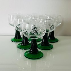 Remmare vinglas säljes. Glasen har en elegant design med etsade mönster och en mörkare fot. Perfekta för vinprovning eller som en stilfull detalj på middagsbordet.