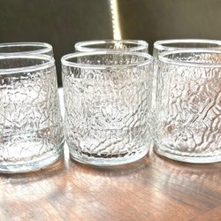 Fyra glas med lite ovanlig form. Troligen tänkta som dricksglas/seltersglas, men fungerar bra även till whisky eller annan sprit. Handblåsta av okänt ursprung. Tunna väggar men lite tyngd i botten.