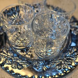 Whiskyglas med mönstrad yta. whiskyglas är transparent och har en rundad form med en lätt oregelbunden kant upptill.
