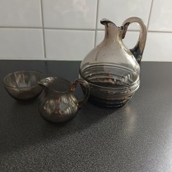 Rektangulär karaff i pressat glas med rökfärgad/silverttonad spegeleffekt. Kort hals med kraftig, matchande glaspropp. Antikpatinerad yta som ger ett elegant vintageuttryck. Passar som prydnad eller serveringskaraff.