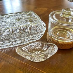 Smörask i glas med lock. Perfekt för att förvara och servera smör. Oval form. Formpressad. Gissar på härdat glas då den är väldigt tung. På undersidan finns 2 ojämnheter på ståkanten från tillverkningen som inte alls påverkar funktion. Märkt 29 i glaset, väldigt litet. Hel och fin. Ytterst ytters lite ytrepor som knappt syns. 6,5 x 13 x 20 cm.